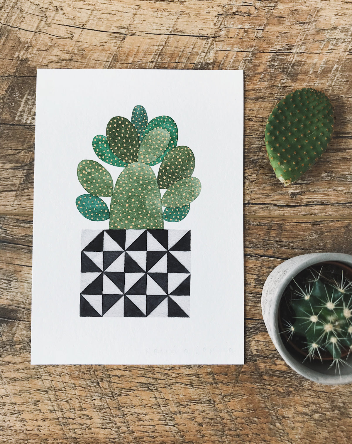 An original painting of a bunny ear cactus in a geometric pot, printed on warm white card stock. The perfect mix of nature and modern design, this print will be an eye-catching addition to any room.