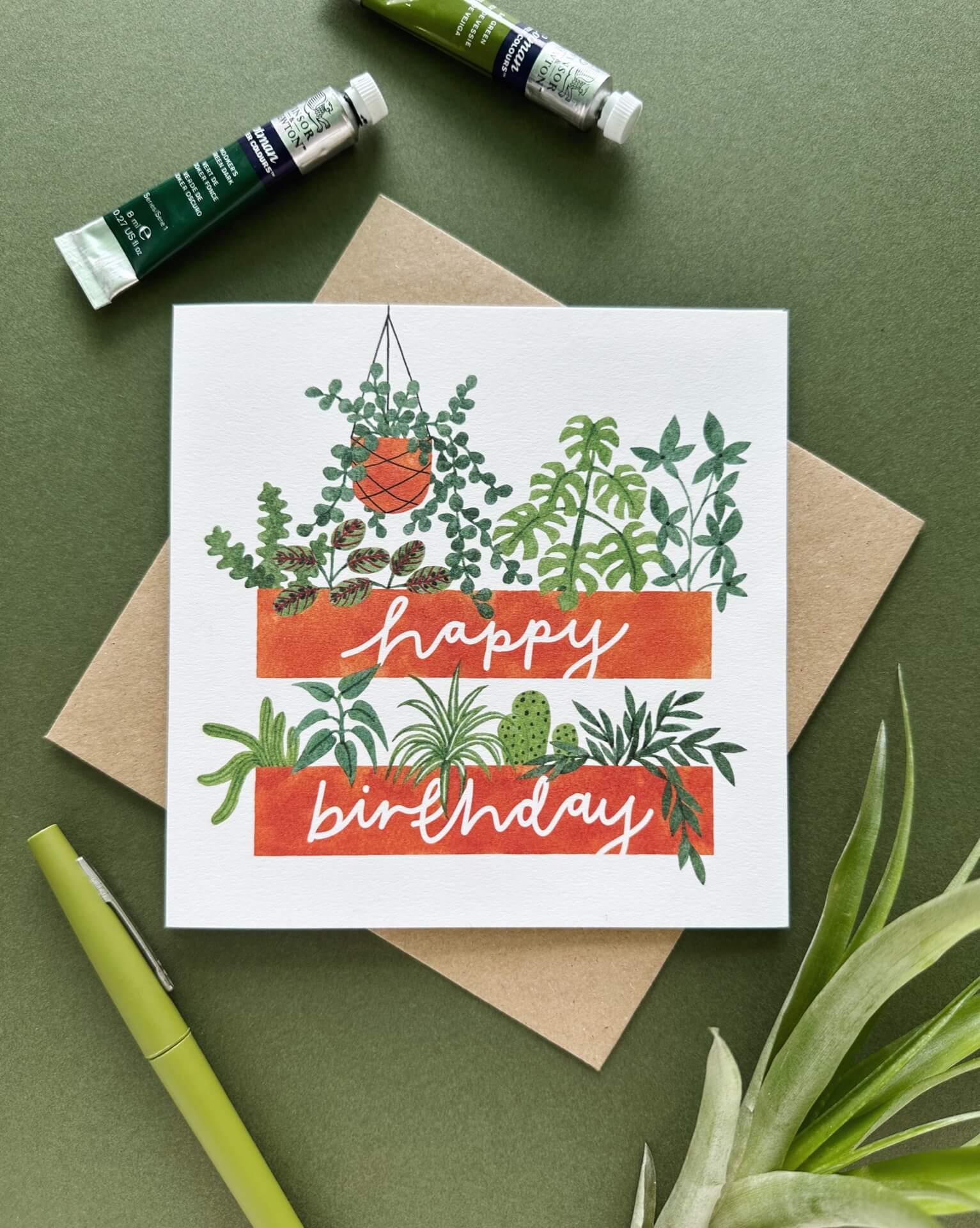 White ‘happy birthday’ lettering on two long wall planters filled with lots of different houseplants and with a hanging peperomia plant adding asymmetrical flair to the design. It's a perfect pick to wish a beloved plant-enthusiast happy birthday on their special day!