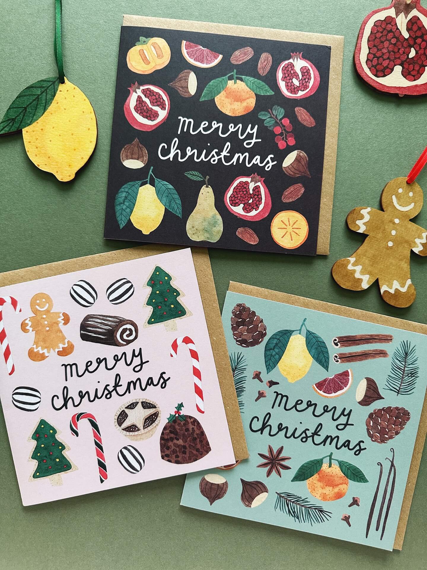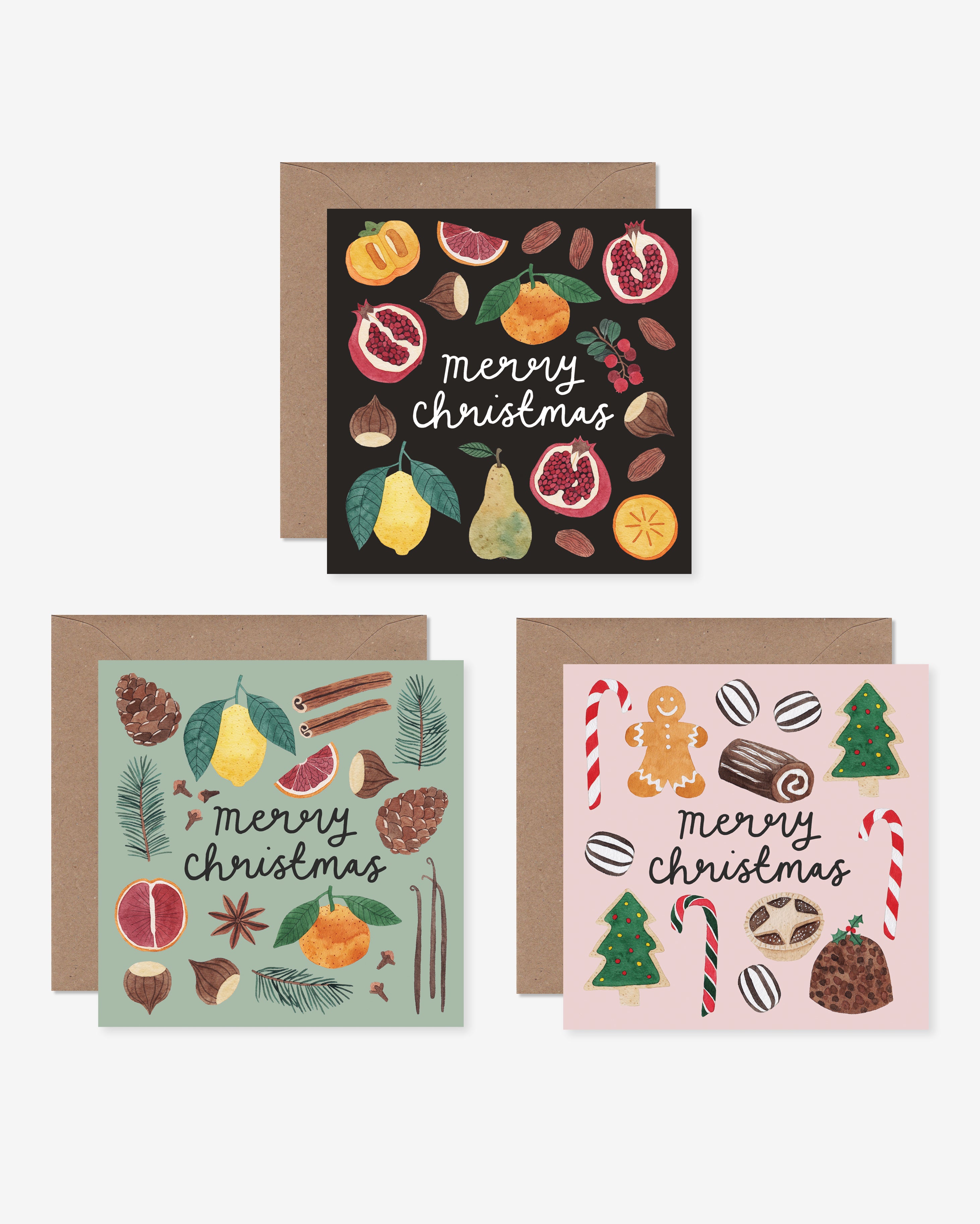 The pack of 12 Christmas cards includes four of each design; Winter Fruits, Seasonal Scents, and Holiday Treats.