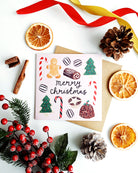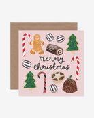 This Holiday Treats Christmas card is from the ‘A Taste of Christmas’ collection, inspired by the yuletide feeling evoked by festive food and scents. The design shows a collage of festive treats: candy canes, gingerbread man, humbug sweets, chocolate log cake, Christmas tree shortbread, mince pie, and Christmas pudding.