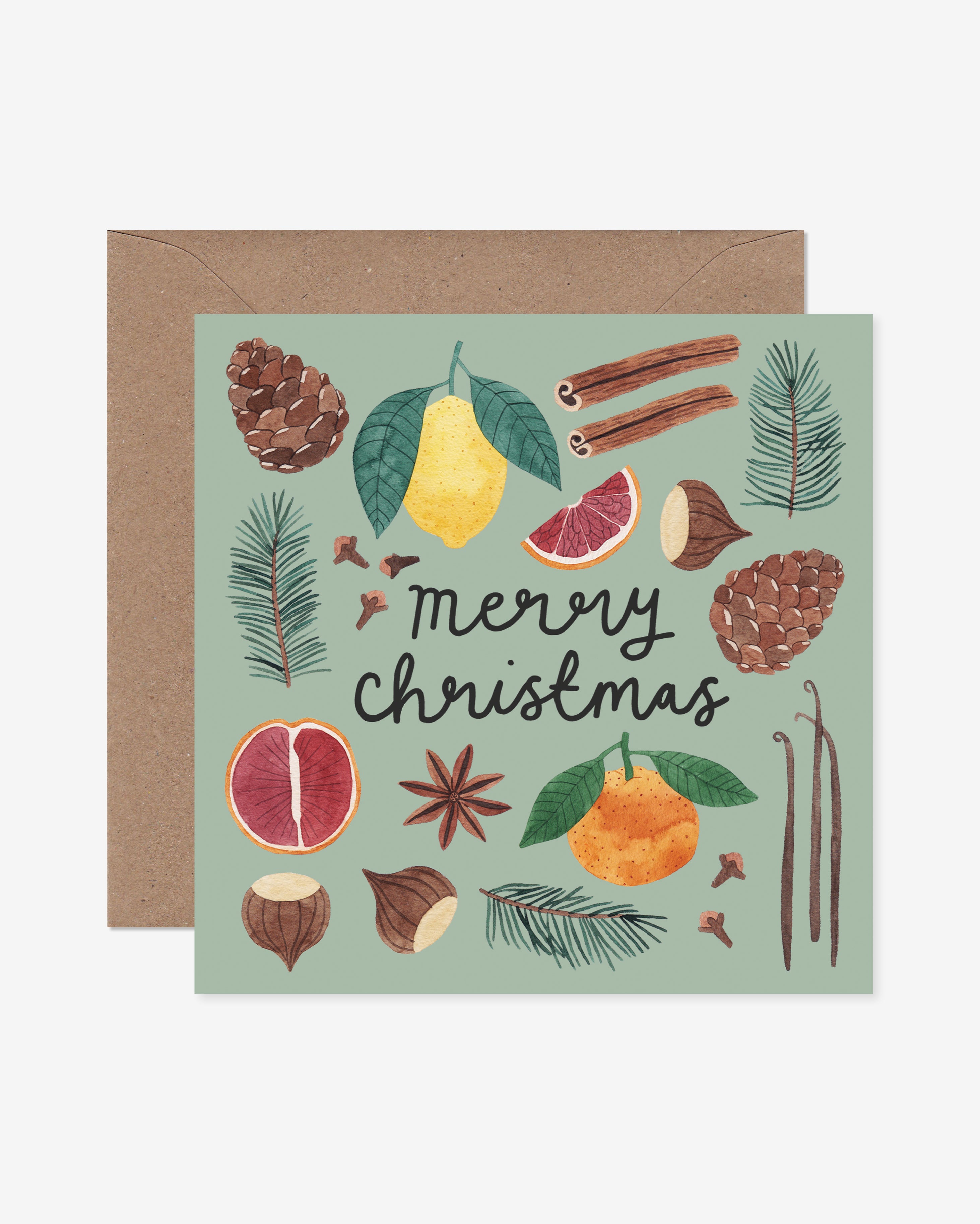 This Seasonal Scents Christmas card is from the ‘A Taste of Christmas’ collection and is inspired by the yuletide feeling evoked by festive food and scents. The design shows a collage of festive scents: cinnamon, citrus fruits, cloves, star anise, chestnuts, fir spruce, vanilla, and cedarwood.