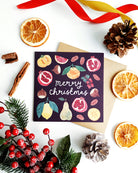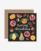 This Winter Fruits Christmas card is from the ‘A Taste of Christmas’ collection and is inspired by the yuletide feeling evoked by festive food and scents. The design shows a collage of winter fruits: citrus fruits, a pear, pomegranates, dates, persimmon, cranberries, and chestnuts.