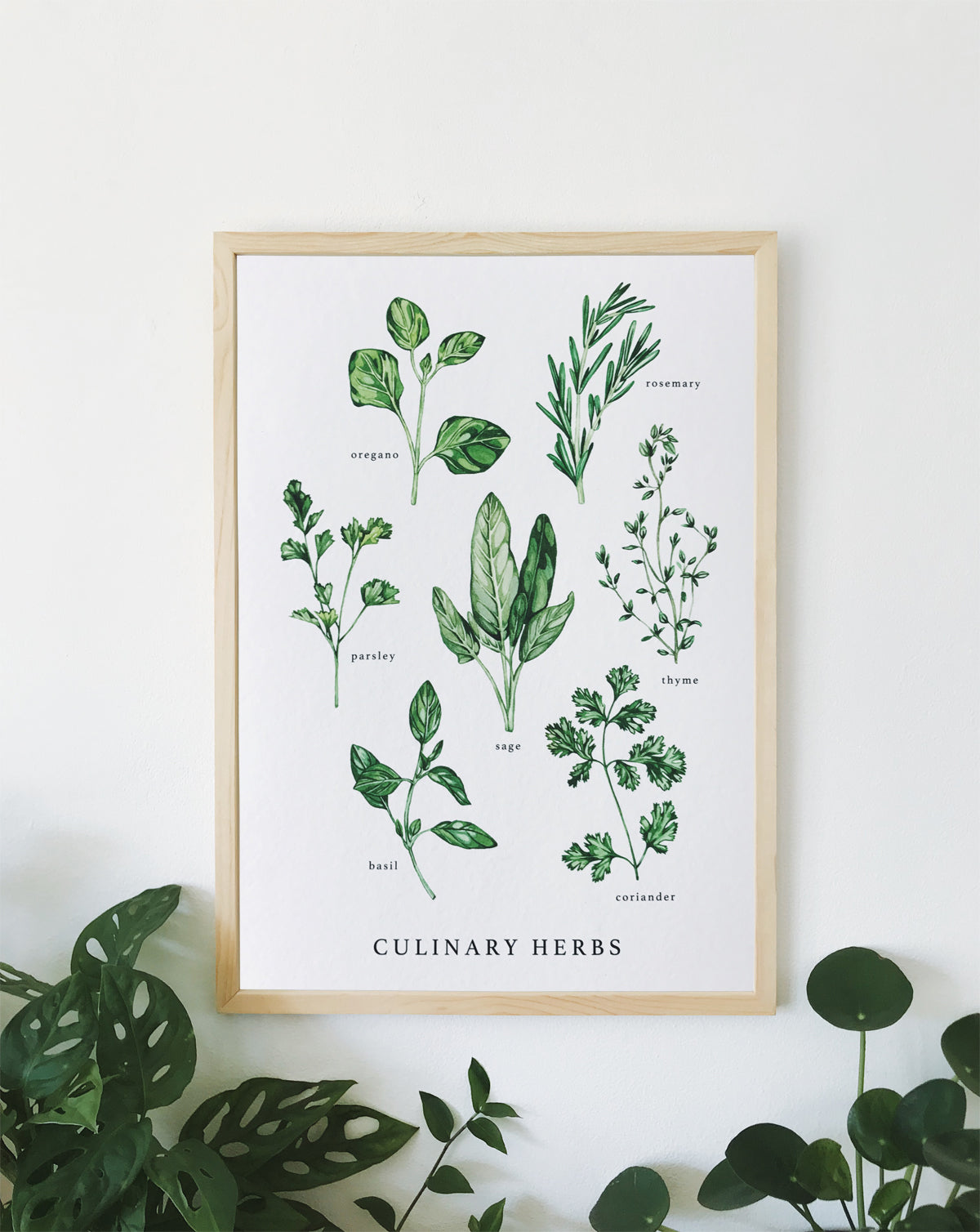 A beautiful herb print to give to a food aficionado or keen chef in your life, or to hang in your kitchen. The print features 7 watercolour herb illustrations with titles: oregano, rosemary, parsley, sage, thyme, basil, and coriander.