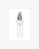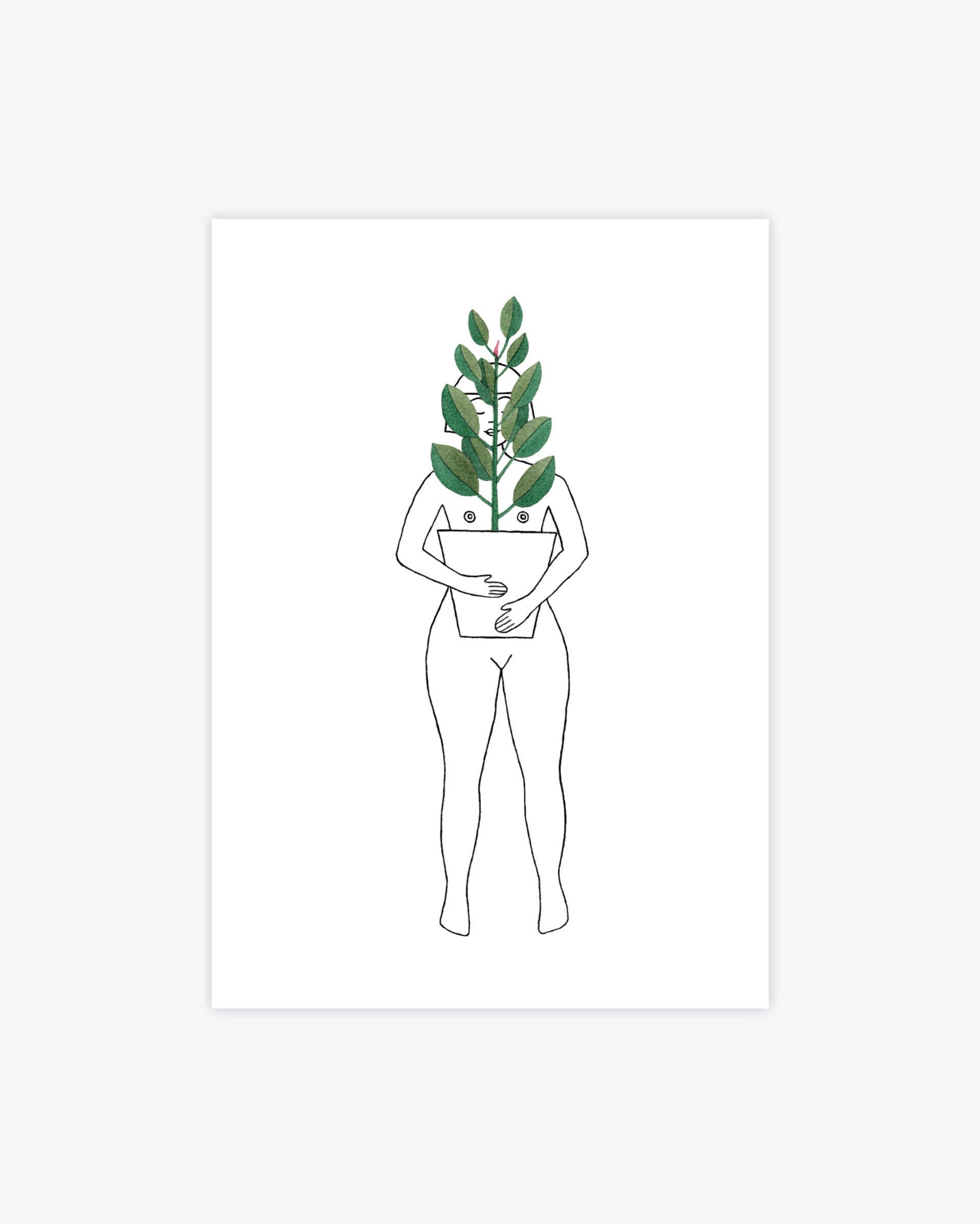 This postcard features a watercolour painting of a person hugging a pot of ficus plant. It provides a little greenery and cheer to any space, from a home office to a shelf or desk!