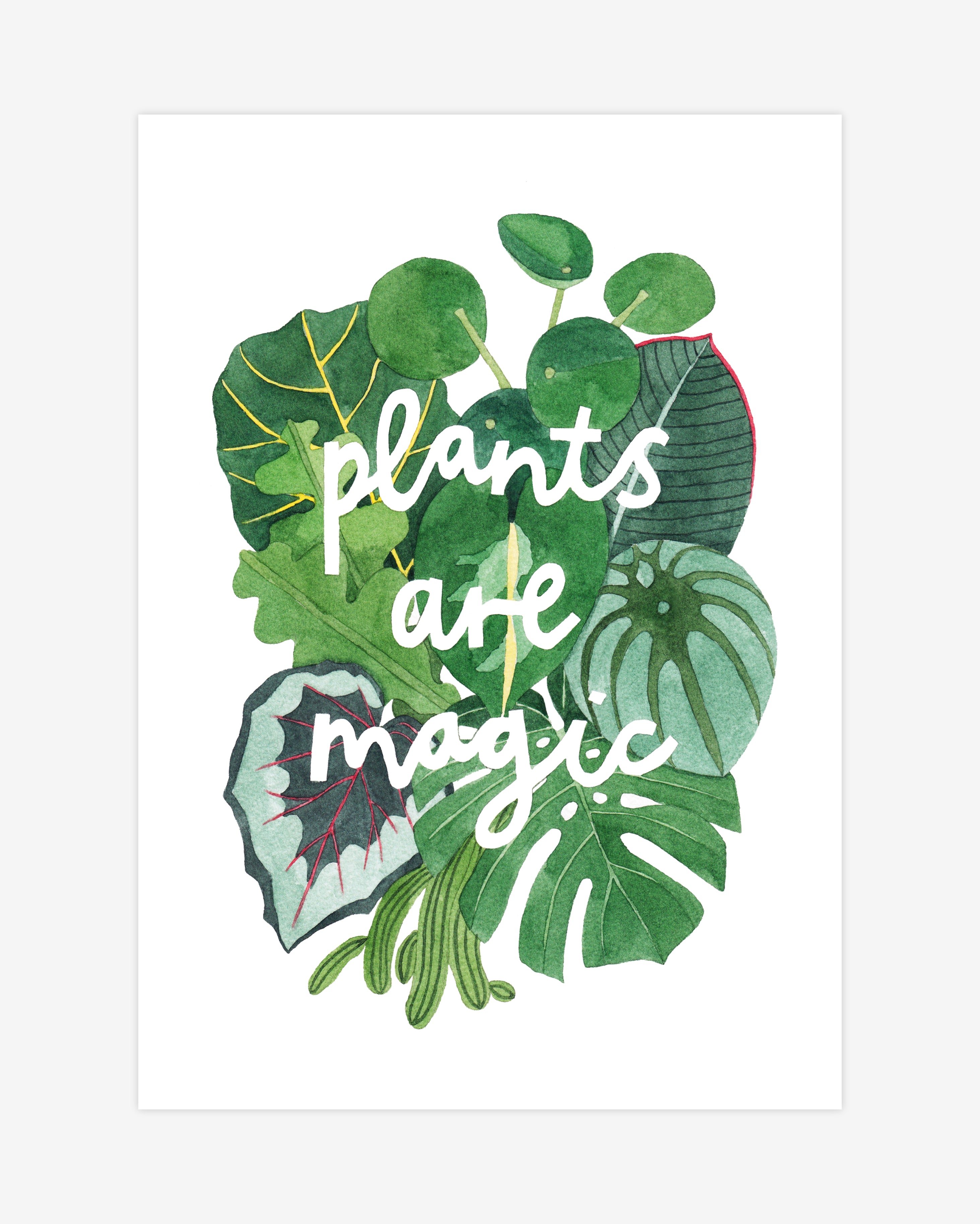 Plants are magic! This botanical print has 'plants are magic' in white text, surrounded by houseplant illustrations. Add a bit of greenery to any room with this whimsical print. Perfect for bringing a touch of botanical serenity to your home.