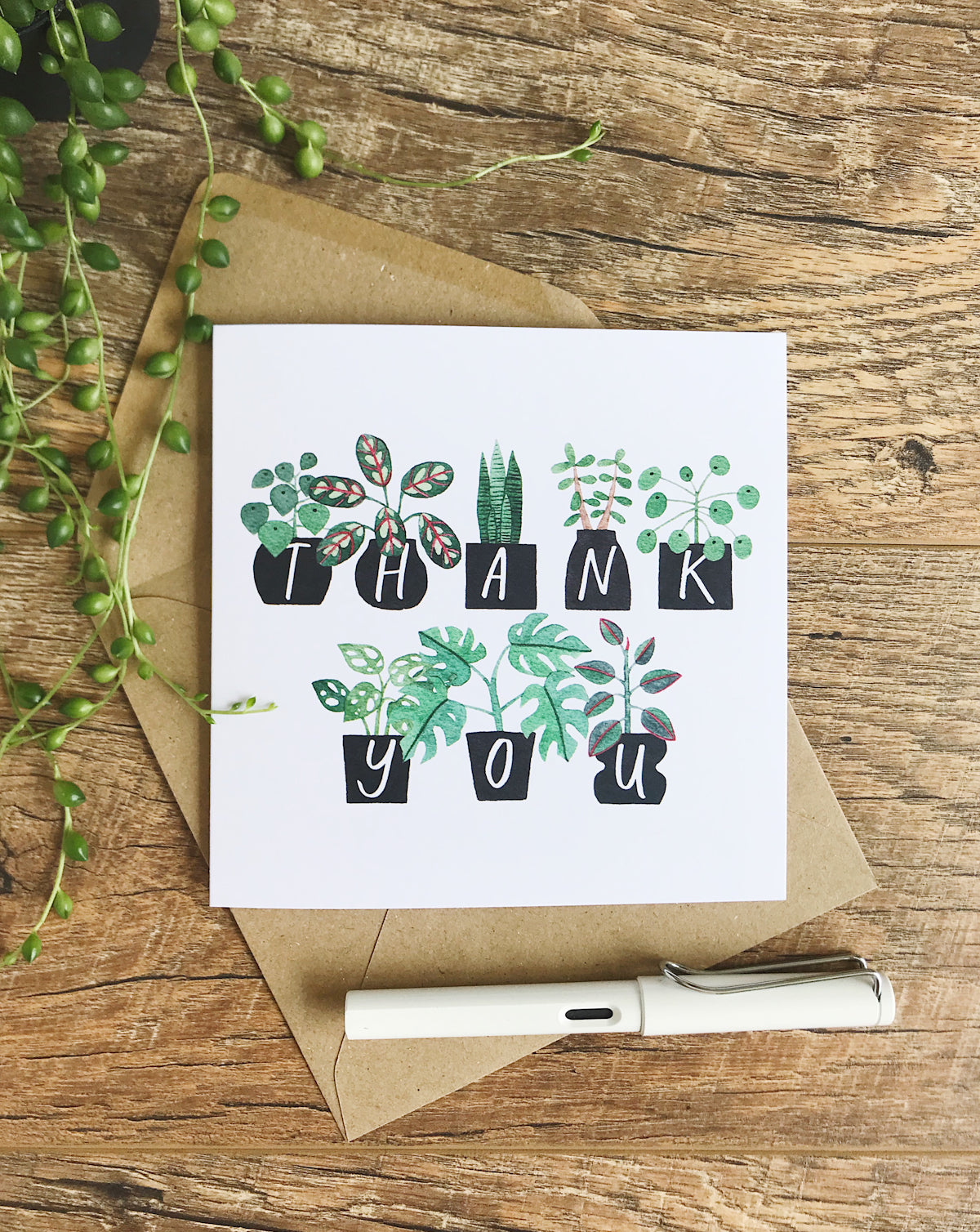 This elegant card showcases 8 different potted plant paintings that form the words 'thank you'. A delightful choice for plant enthusiasts! The design will truly stand out among other cards and is sure to make a statement. With a vibrant display of greenery, your recipient will appreciate your gesture of gratitude.