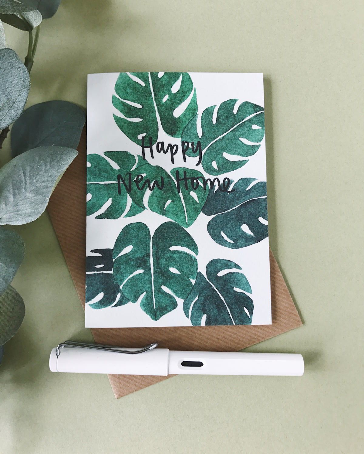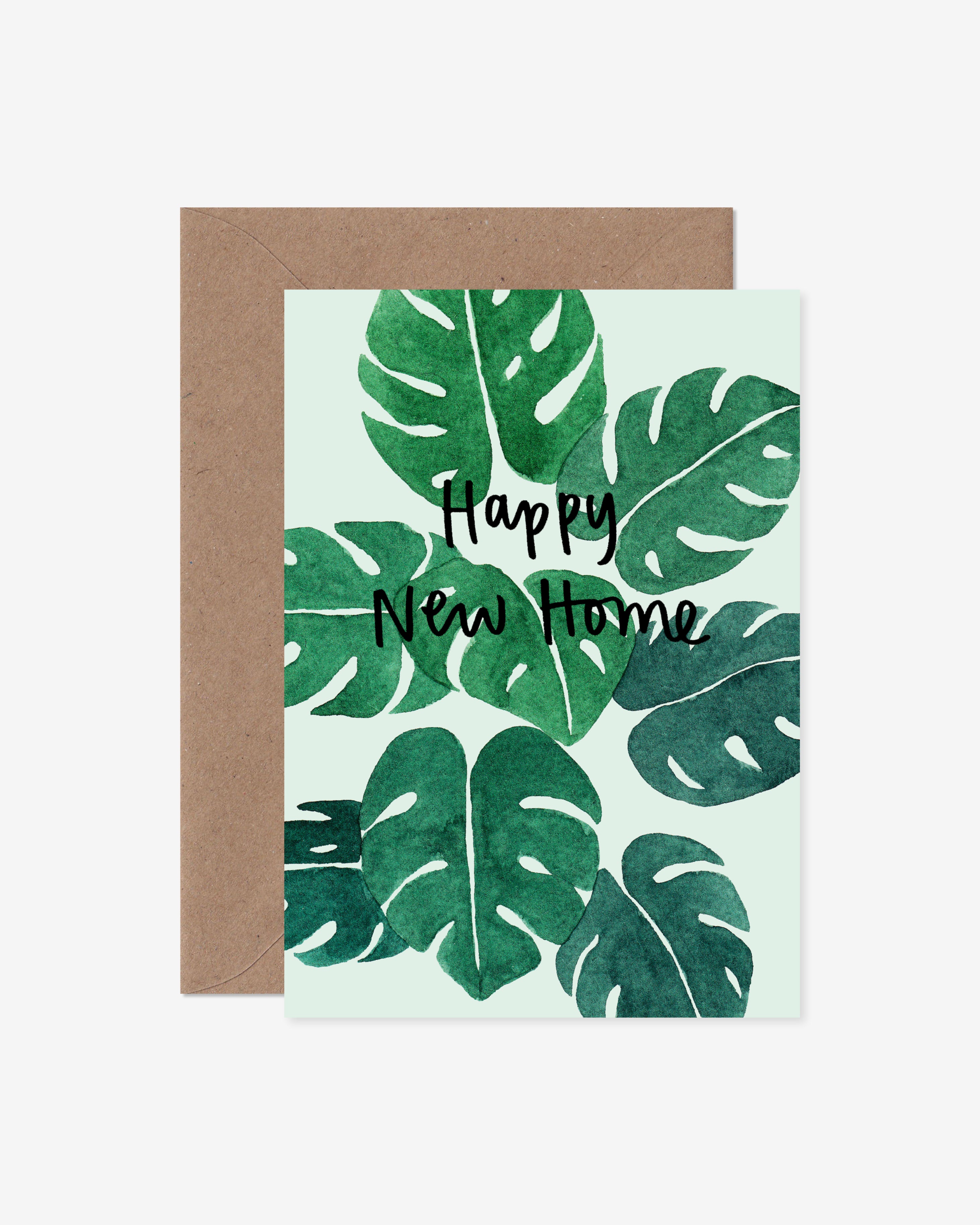 The card features a collage of monstera deliciosa leaves alongside a lettering that reads 'happy new home'. A perfect card to send to your avid houseplant collecting friend! It's a thoughtful and stylish way to wish someone happiness in their new home.