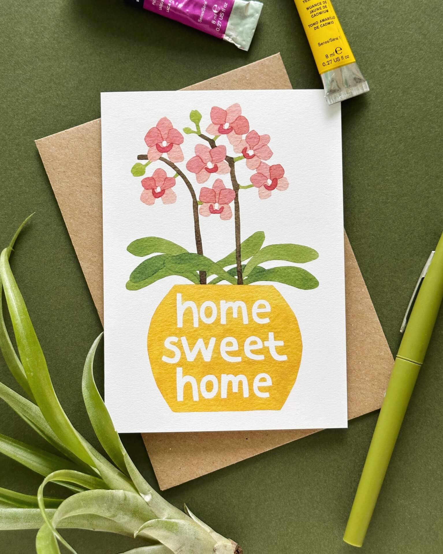 A new home card shows the potted orchid plant with white ‘home sweet home’ lettering on a yellow pot. A thoughtful, delightful card to congratulate new homeowners!