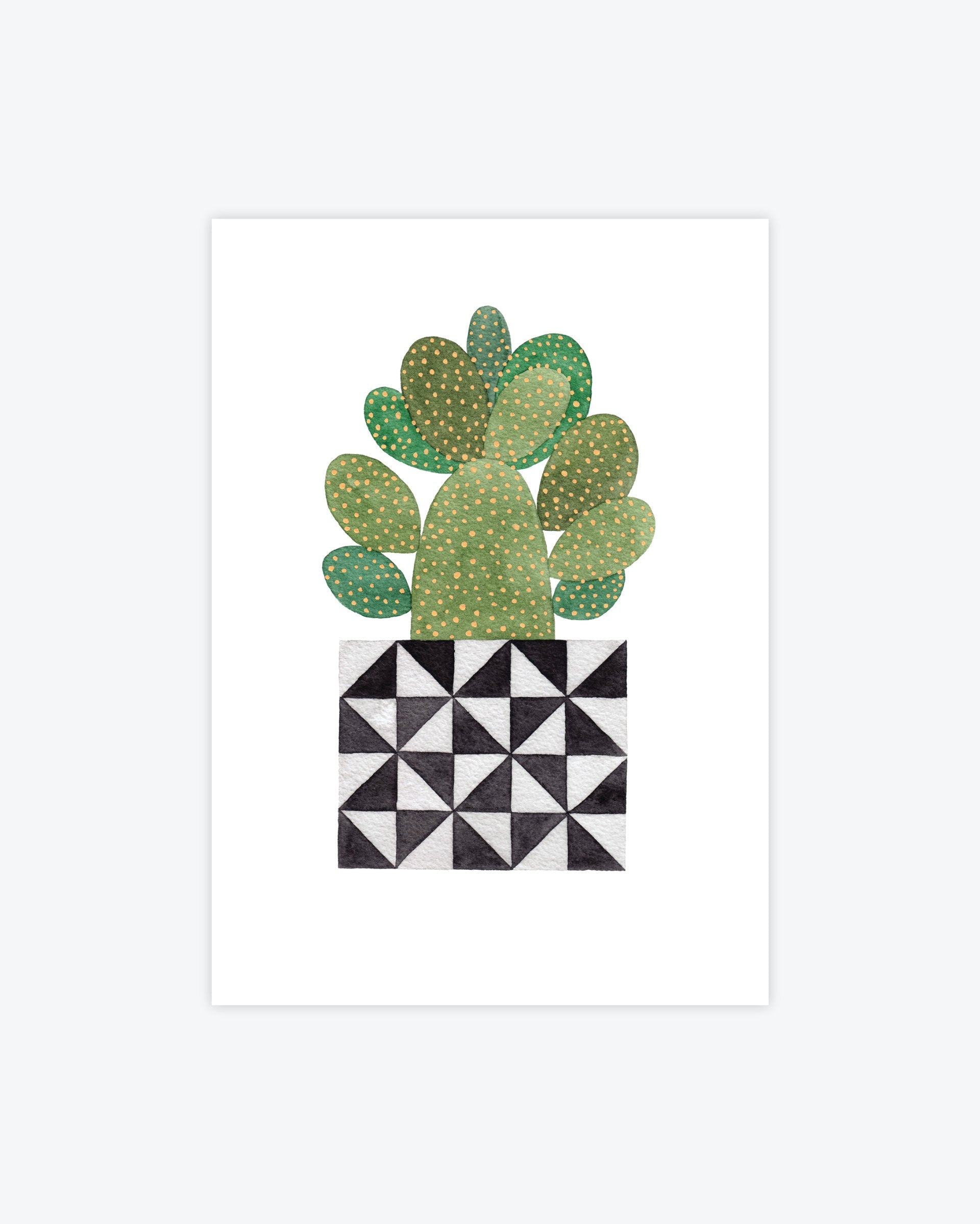 This postcard depicts a watercolour illustration of bunny ear cactus housed in a geometric planter. It's a unique piece of art that you'll love to send to someone or display in your home.