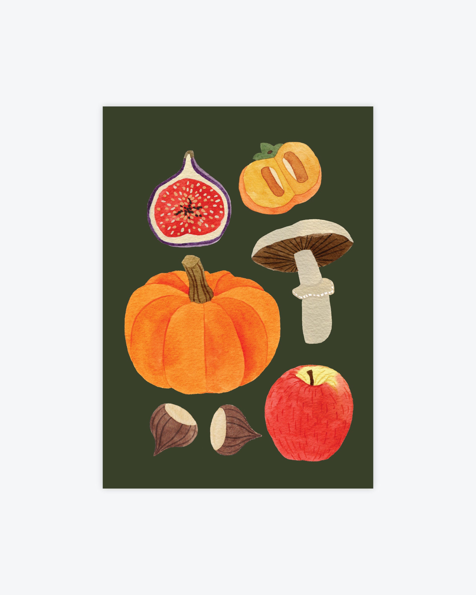 This Autumn Harvest postcard displays a collection of watercolour paintings depicting a fig, persimmon, pumpkin, mushroom, apple, and chestnuts. It's a beautiful reminder of the simple pleasures of the season and the vibrant colours of the autumn harvest.