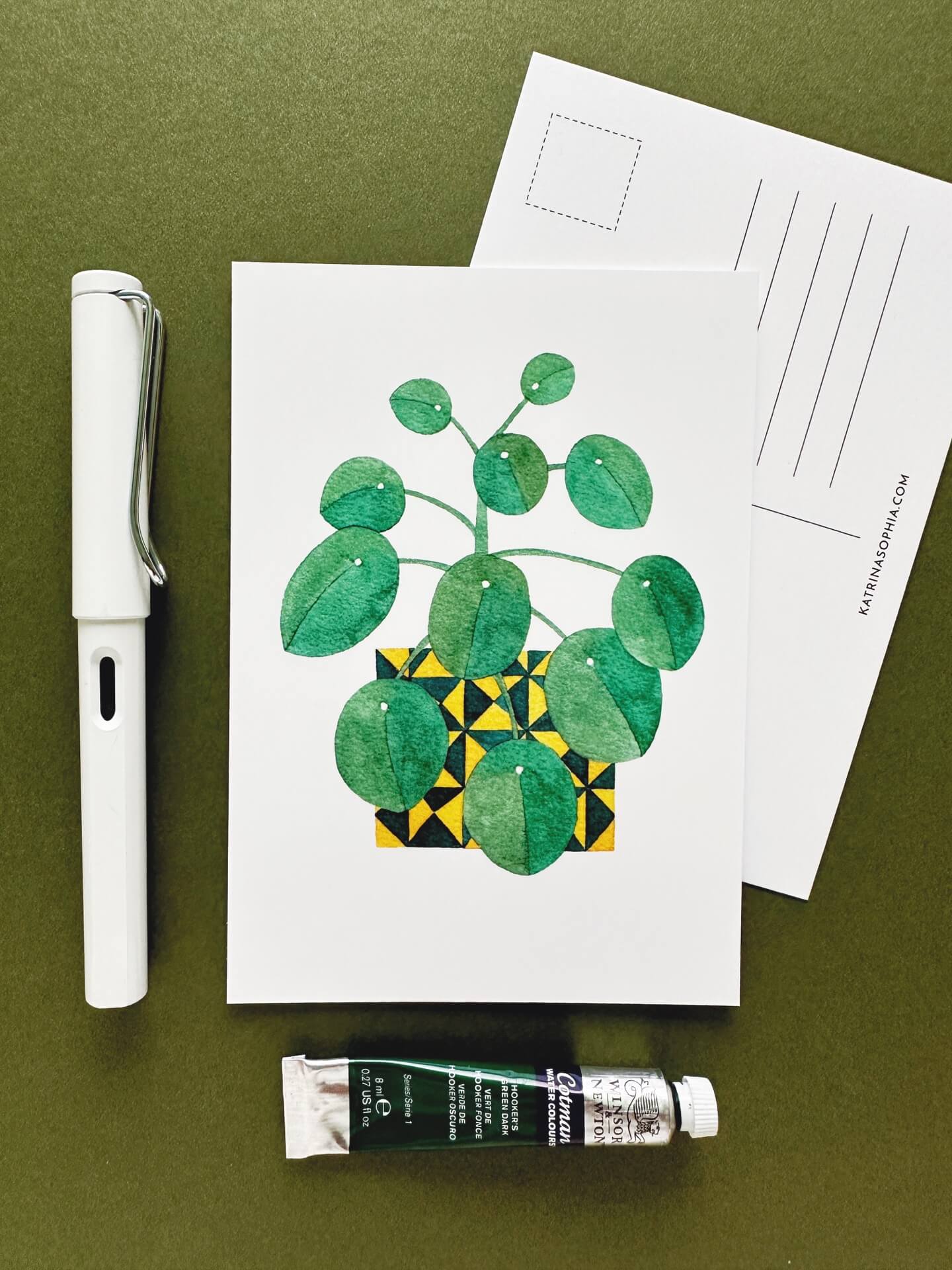 This postcard shows a lovely watercolour of pilea peperomioides in a stylish geometric pot. It is an ideal way to bring cheer to a loved one or to liven up your own space!- Measures A6 / 148mm x 105mm