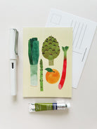 This Spring Harvest postcard displays a collection of watercolour paintings depicting a leek, asparagus, artichoke, apricot, and rhubarb. The subtle colours of the illustrations evoke a sense of springtime. Send warm words to an amiable gardening pal with this sweet postcard.