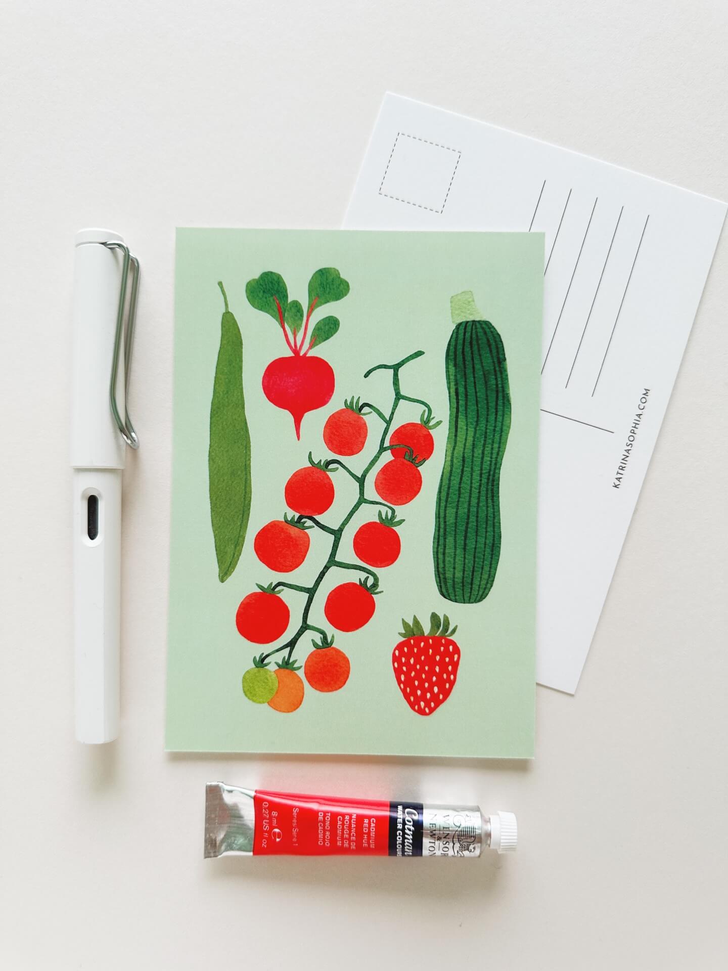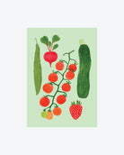 This Summer Harvest postcard displays a collection of watercolour paintings depicting a runner bean, radish, courgette, strawberry, and tomatoes. The vivid and cheerful colours of the illustrations evoke a feeling of summertime. Send kind sentiments to a friendly gardening companion with this pleasant postcard.