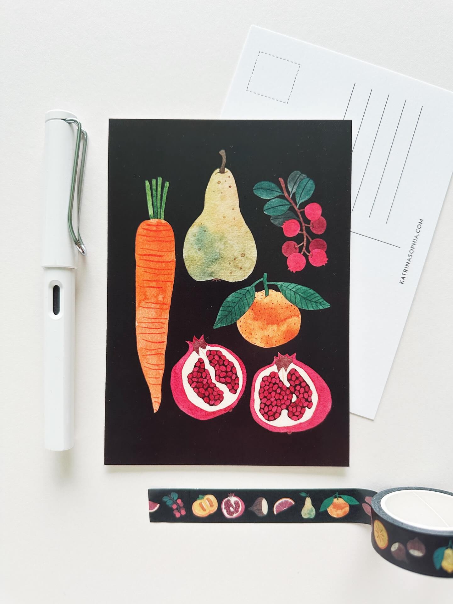 This Winter Harvest postcard displays a collection of watercolour paintings depicting a carrot, pear, orange, cranberries and pomegranates. These timeless, yet vibrant watercolour paintings make this postcard a special gift for friends and family.