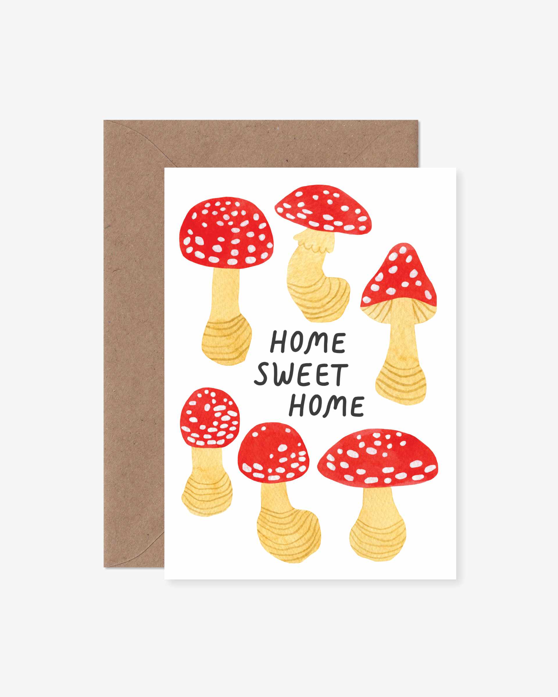 This card shows 6 different toadstool illustrations surrounding ‘home sweet home’ lettering. A sweet sentiment for any home; perfect for sending special wishes to friends and family.