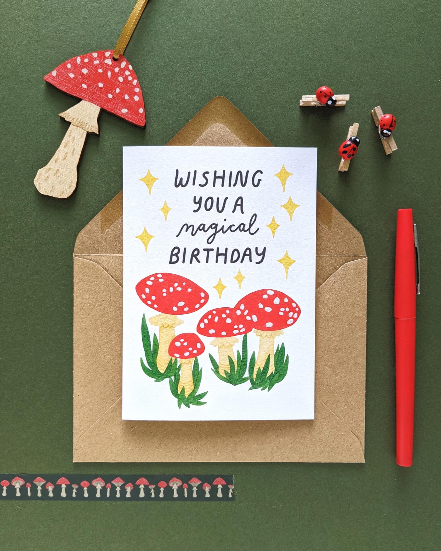 This illustrated birthday card shows a group of toadstools with yellow stars above, scattered around lettering which says ‘wishing you a magical birthday’. A perfect birthday card for your toadstool-loving friend! It's a guaranteed way to make any birthday gift extra special.