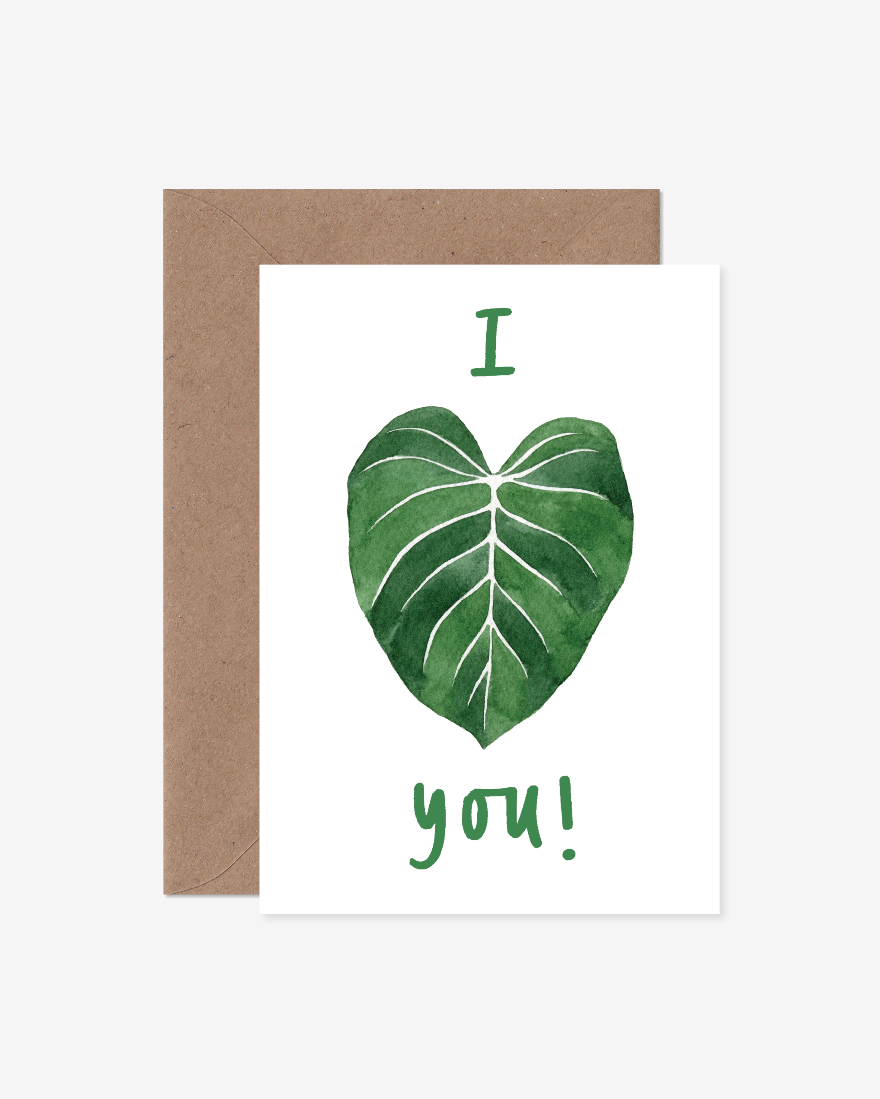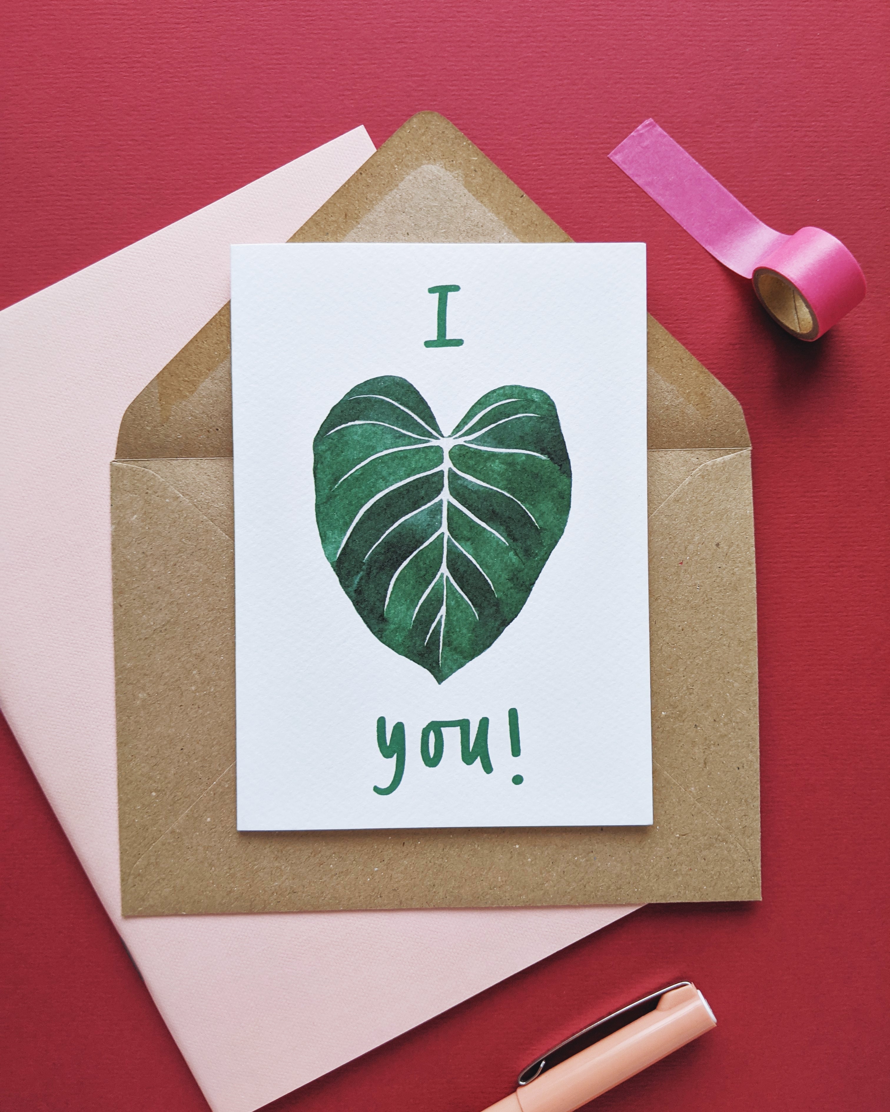 This adorably unique card features a heart-shaped Philodendron leaf for a playful touch.