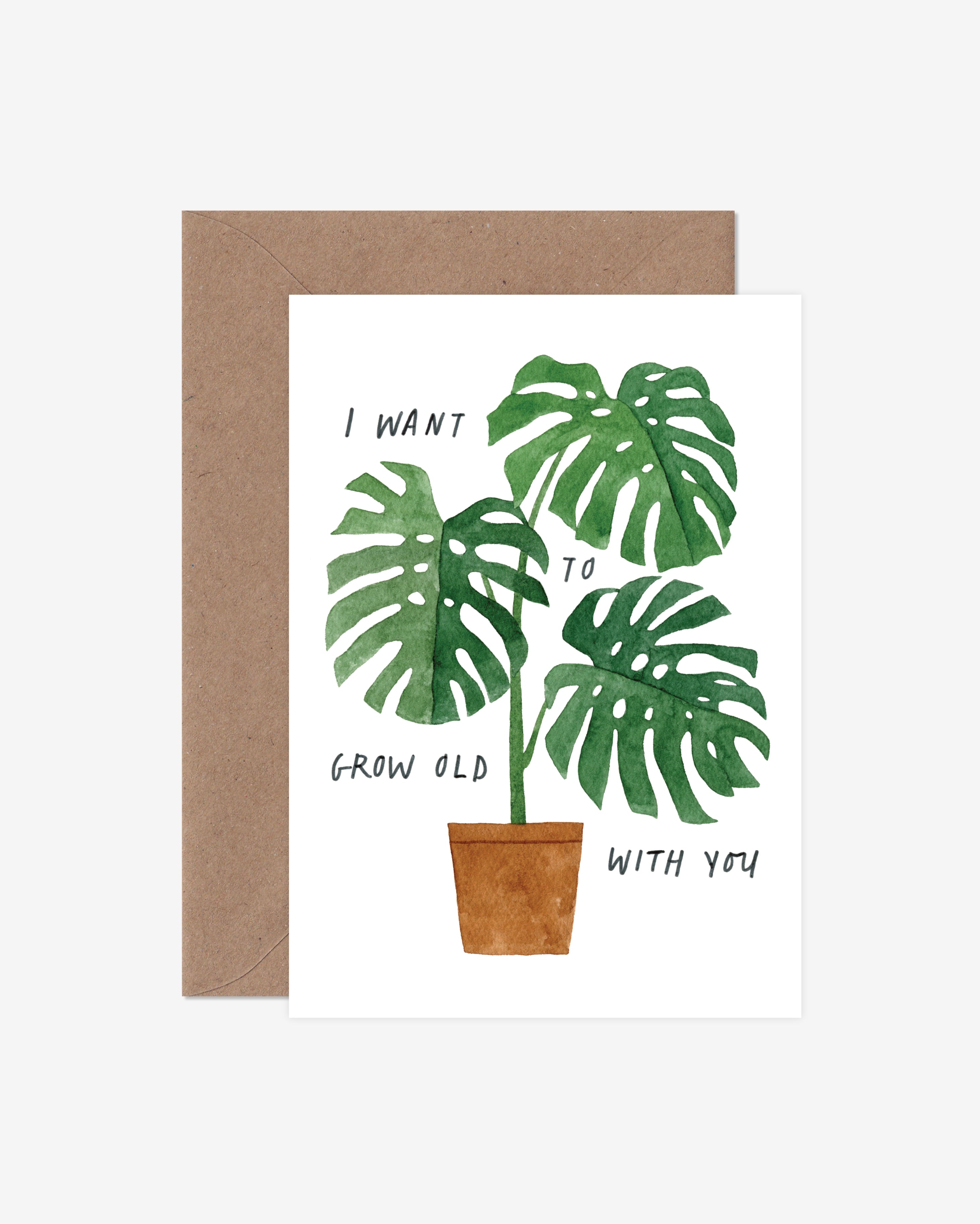 With ‘I want to grow old with you’ lettering cascading from a delicious Monstera, this heartfelt card shows your commitment.