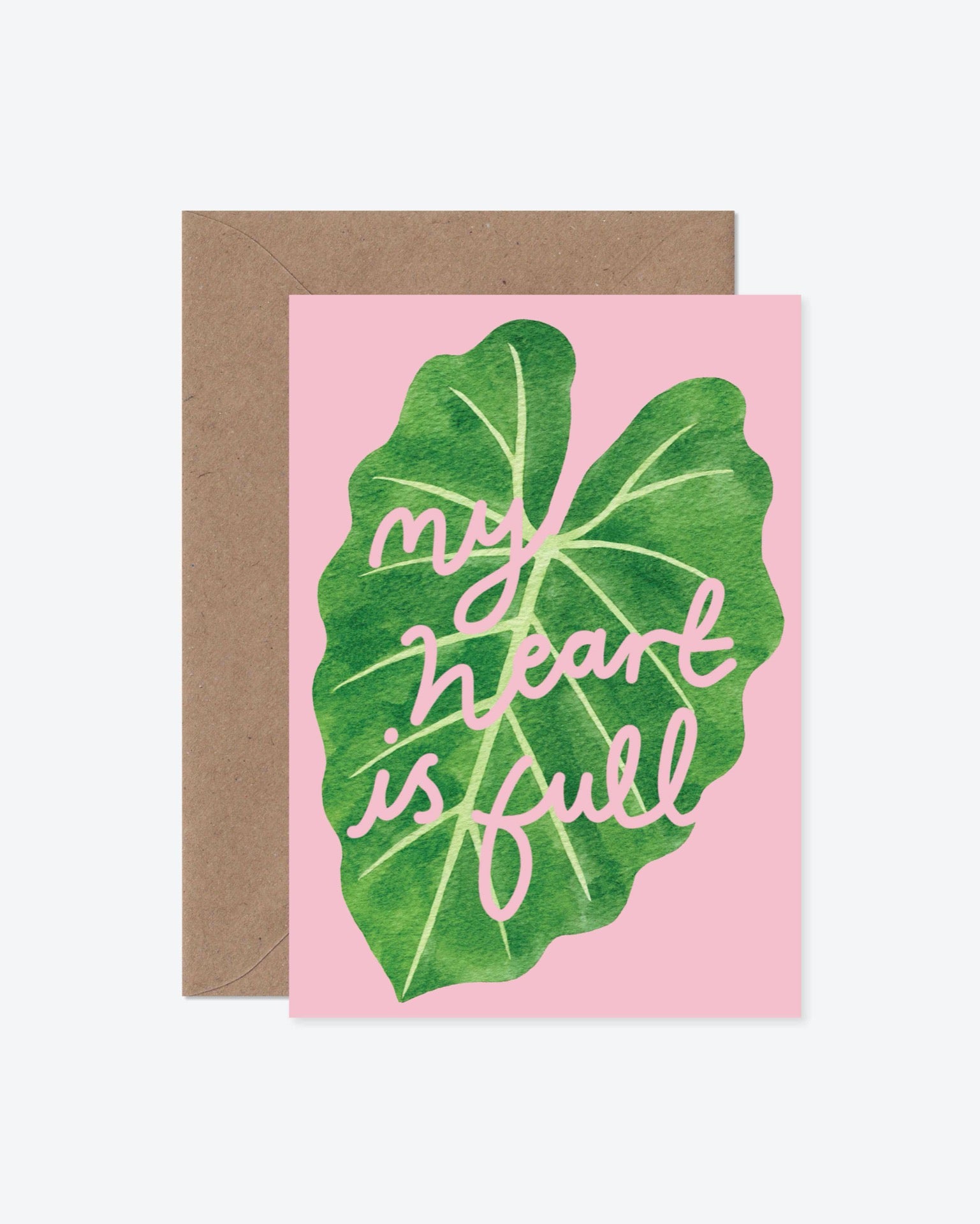 This lovey-dovey card shows a crinkled edged alocasia leaf with ‘my heart is full’ lettering in a pink colour matching the background of the card. This card is the perfect way to express your affection for your special someone. Show them you care with this meaningful and thoughtful card.