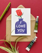 This charming card depicts a vibrant red rose in a striking indigo vase, accompanied by subtle white text reading 'I love you'. Send a heartfelt message with this sweet card. It's the perfect way to express your love to someone special.