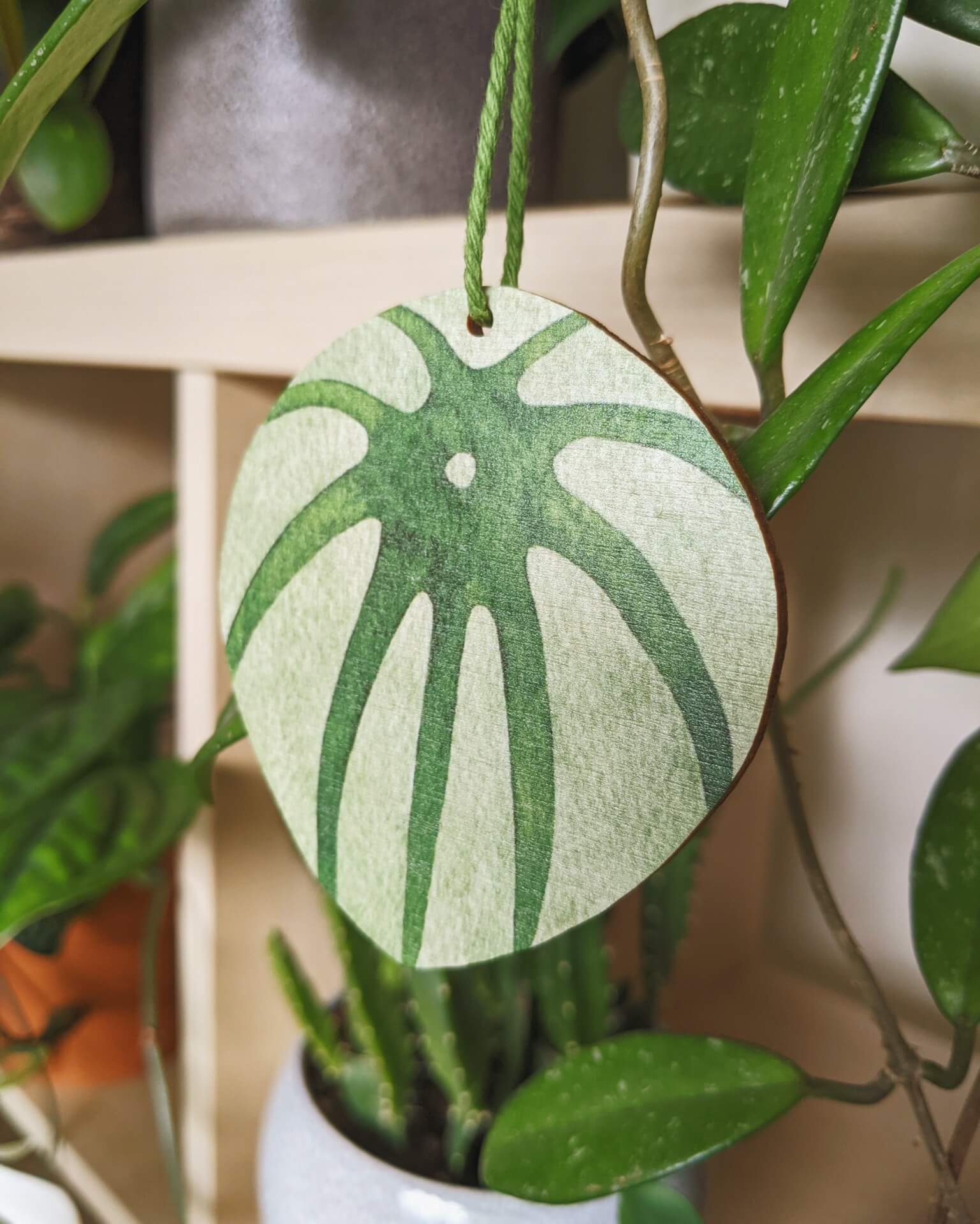 A houseplant leaf, printed from an original watercolour illustration and resembling a watermelon, is a hanging decoration that makes a thoughtful gift to your plant loving pal. The leaf is printed on wood, giving a natural feel to the decoration. You'll love the realistic colours and intricate details of this design.